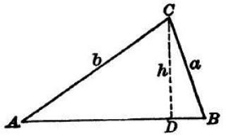 In the diagram above, we drop a perpendicular from C onto AB, and label that point D. We will find h in terms of A, a, B and b in 2 different ways: